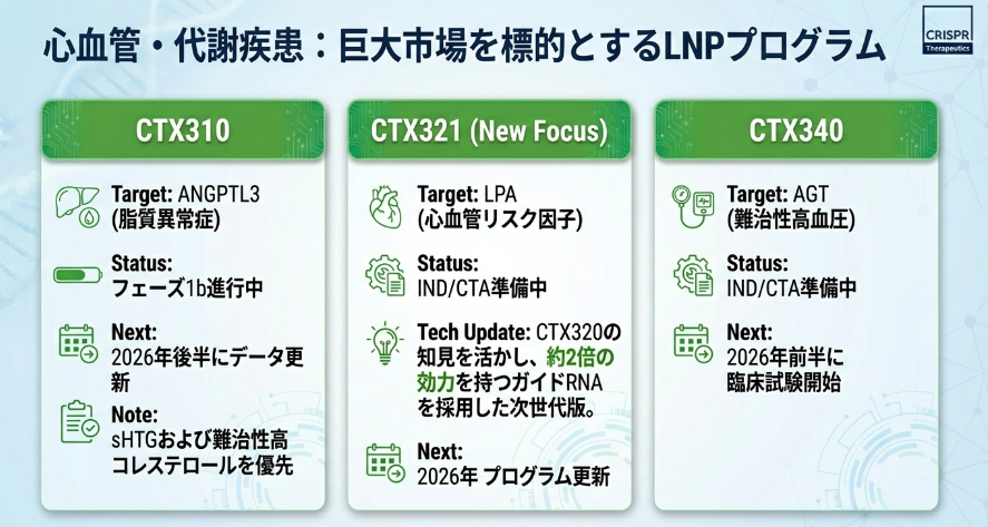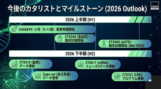 自己免疫・がん治療薬(zugo-cel)、心疾患(CTX310)、血栓症(CTX611)など主要プログラムについて、2026年後半に重要なデータアップデートを予定。