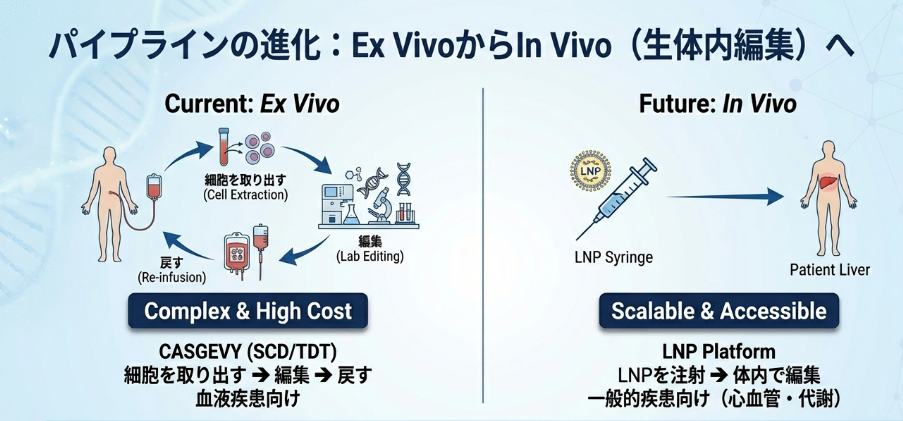 これ 次世代のアプローチで、 今までは一度体から細胞を取り出して編集してまた体に戻すっていう、かなり複雑な工程が必要だった。しかも治療費が数億円規模と恐ろしい高額になる課題も…😟