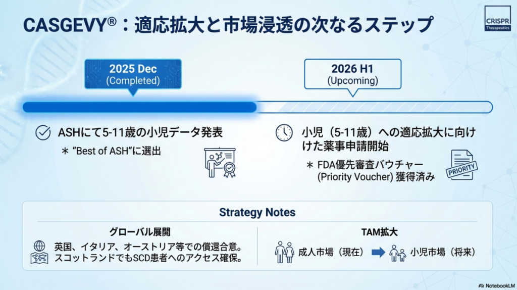 CASGEVYの収益化が本格的な軌道に乗り(Q4で売上が加速)、約20億ドルの資金を背景に、2026年後半の次世代薬データ発表に向けた「仕込み」が着実に進んでいる四半期と言えます。